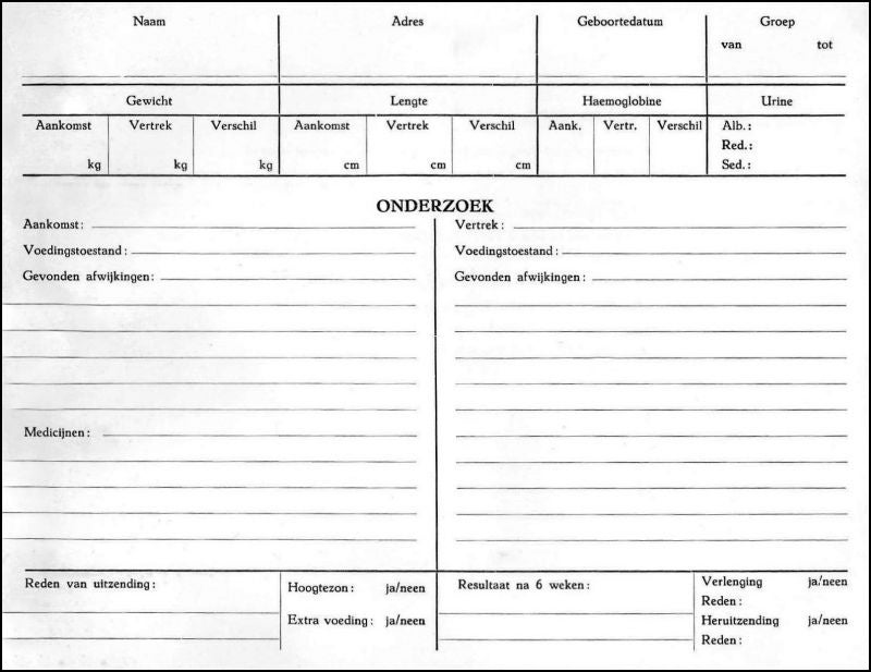 Het ontbijt om 08.10 uur bestond uit een bordje pap, twee sneetjes brood en een beker melk. Om 12.00 uur werd er vlees, aardappelen en groenten gegeten, meestal gestampt en als toetje vla. Om 17.00 uur werd er brood gegeten met een beker melk. Als het zomers heel erg warm weer was kregen de kinderen een zout dropje.