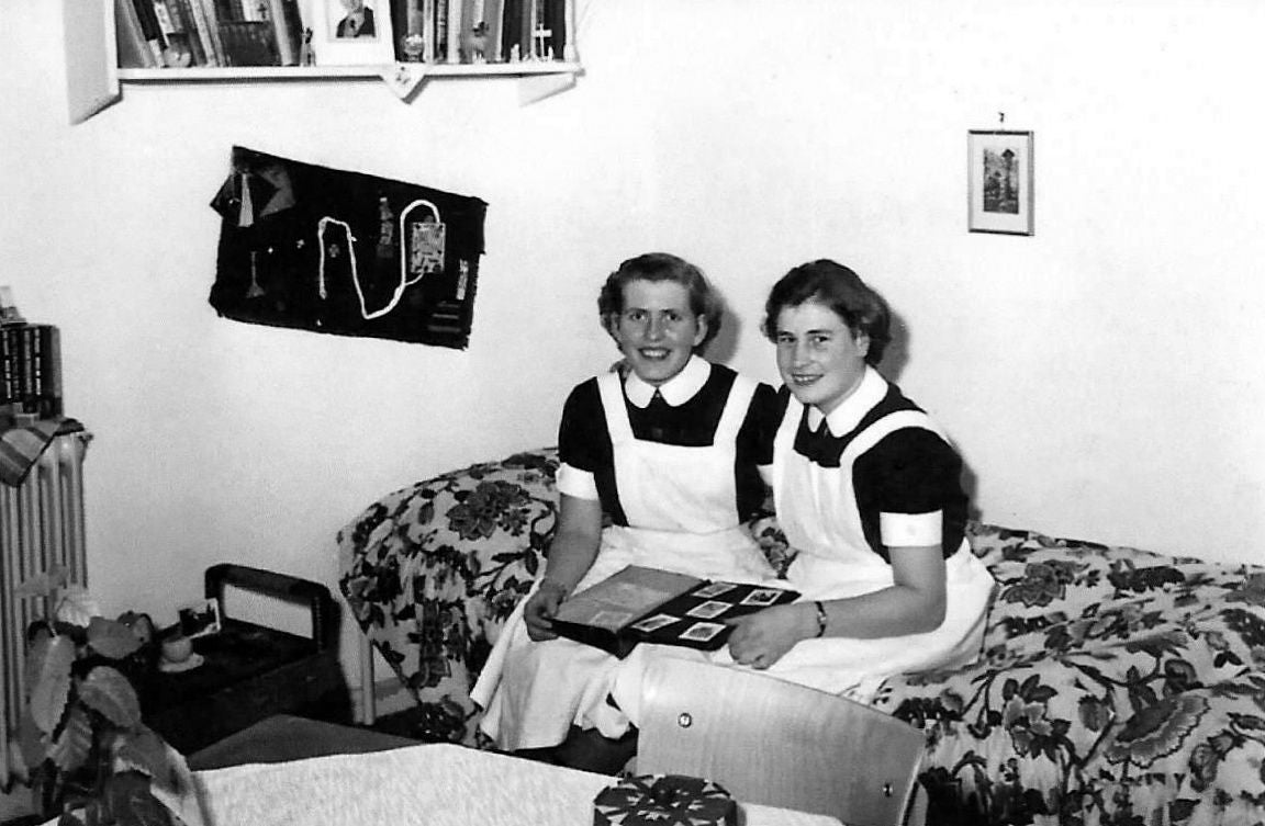 Voor de garderobe samen met Zr. Berla op 2 juli 1954