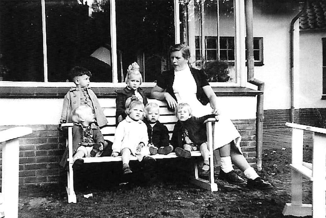 Met de allerkleinsten heerlijk in de zon: Marja Wouters-Ine Schoonons-Gerda Blok- Betsie Kusters-Josje Kugs en Jaapie Lijten op 11 april 1954