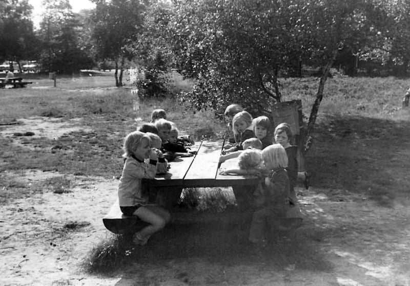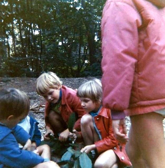 Ze vroegen ook wel eens waarom de blaadjes van de bomen vallen en waarom ze nu zo'n bruin en gelige kleur hebben. Ze verzamelden ook van alles: eikels, steentjes, stokjes en zand in busjes of plastic potjes. Als er een zei:"Ik zie een kaboutertje, dan hadden ze allemaal dat kaboutertje natuurlijk óók gezien. En dan beweerden ze ook nog stellig dat het kaboutertje een rood mutsje op had! Ze lagen met hun neusjes op de grond om te kijken of het kaboutertje nu soms onder de paddenstoel zat want gezien hadden ze hem allemaal toch zeker? "Och, het kaboutertje slaapt nu even" zei toen een kindje, waarmee het probleem voor iedereen meteen weer opgelost was! Wat waren ze heerlijk spontaan en enthousiast als ze iets zagen wat hen boeide. Sommige kinderen kletsten je gezellig de oren van het hoofd, andere waren weer wat stiller. Het ene kind liep graag aan de hand van de juf, weer anderen dolden graag of kibbelden wat met andere kinderen.